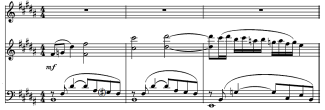 At this stage, the chord progression is straightforward: B major to E minor. But the dissonance from the percussion triangle is actually pointing to an added G on the B. I transcribe it thus: